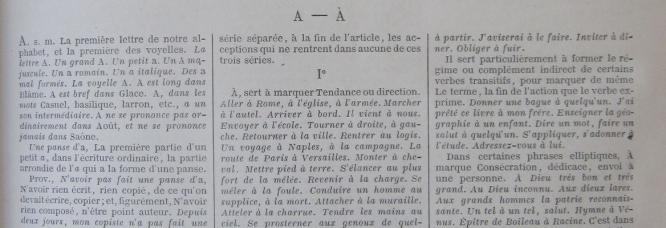 Outre les additions de mots nouveaux et de locutions nouvelles, mille changements ont été faits dans l’intérieur même des articles qu’il serait impossible d’énumérer ici. Des articles entiers ont été remaniés d’un bout à l’autre, les articles relatifs, par exemple, aux prépositions A et De. L’Académie, au contraire, a été très sobre de retranchements; trois cents mots, environ, ont disparu, et un nombre, il est vrai, plus grand de locutions tout à fait vieillies, de proverbes passés d’usage et qu’un tour spirituel et fin ne recommandait pas à l’indulgence des juges.
