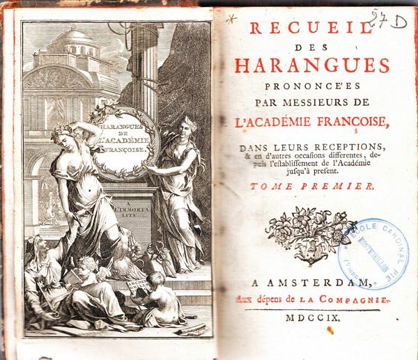 Ce discours, malheureusement, n’est pas répertorié dans les Archives de l’Académie française, n'ayant fait l'objet d'aucune publication dans le Recueil des Harangues.